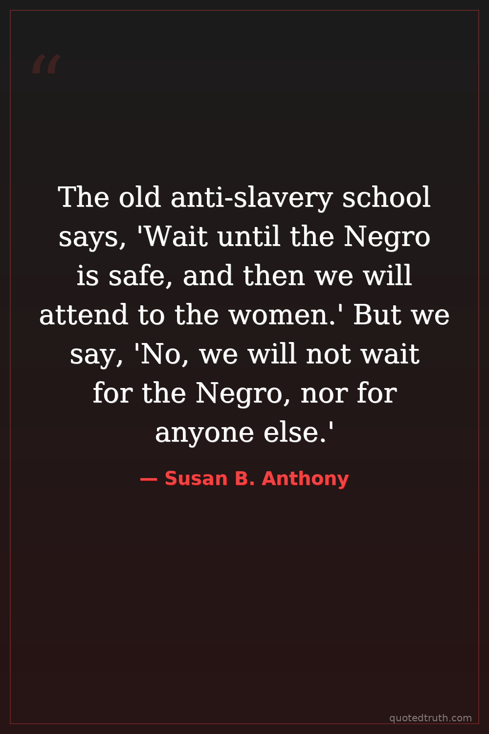 The old anti-slavery school says, 'Wait until the Negro is safe, and then we will attend to the women.' But we say, 'No, we will not wait for the Negro, nor for anyone else.'