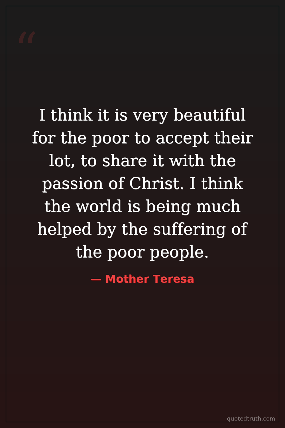 I think it is very beautiful for the poor to accept their lot, to share it with the passion of Christ. I think the world is being much helped by the suffering of the poor people.