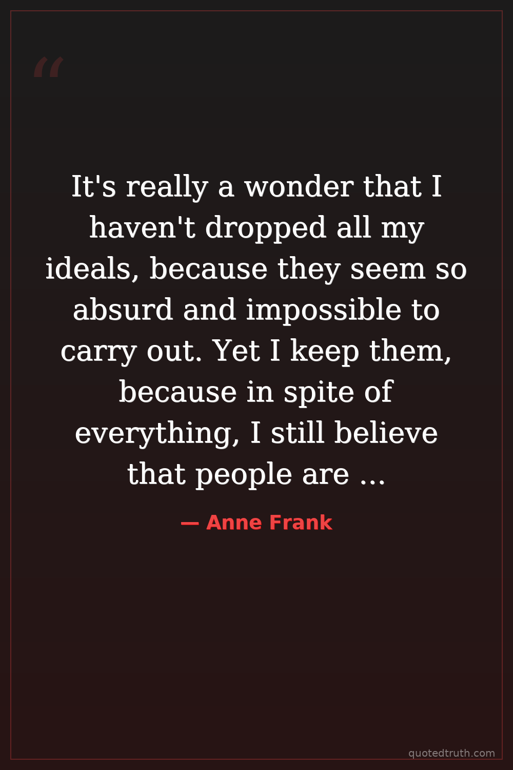 It's really a wonder that I haven't dropped all my ideals, because they seem so absurd and impossible to carry out. Yet I keep them, because in spite of everything, I still believe that people are really good at heart.