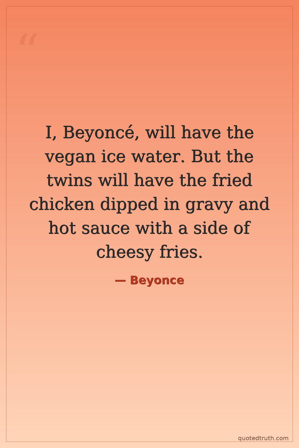 I, Beyoncé, will have the vegan ice water. But the twins will have the fried chicken dipped in gravy and hot sauce with a side of cheesy fries.