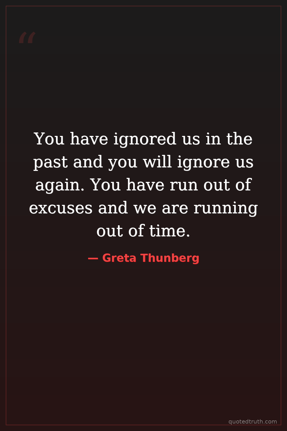 Controversial"You have stolen my dreams and my childhood with your empty words. And yet I'm one of the lucky ones. People are suffering. People are dying. Entire ecosystems are collapsing. We are in the beginning o…"