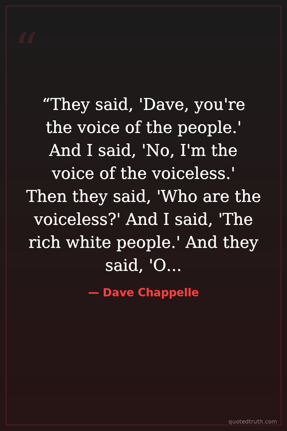 “They said, 'Dave, you're the voice of the people.' And I said, 'No, I'm the voice of the voiceless.' Then they said, 'Who are the voiceless?' And I said, 'The rich white people.' And they said, 'Oh, you're just joking.' And I said, 'No, I'm not. They never get to say anything without being judged.'”