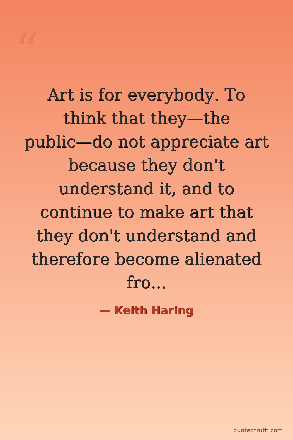 Art is for everybody. To think that they—the public—do not appreciate art because they don't understand it, and to continue to make art that they don't understand and therefore become alienated from, may mean that the artist is the one who doesn't understand or appreciate art and is thriving in this “self-proclaimed knowledge of art” that is actually bullshit.
