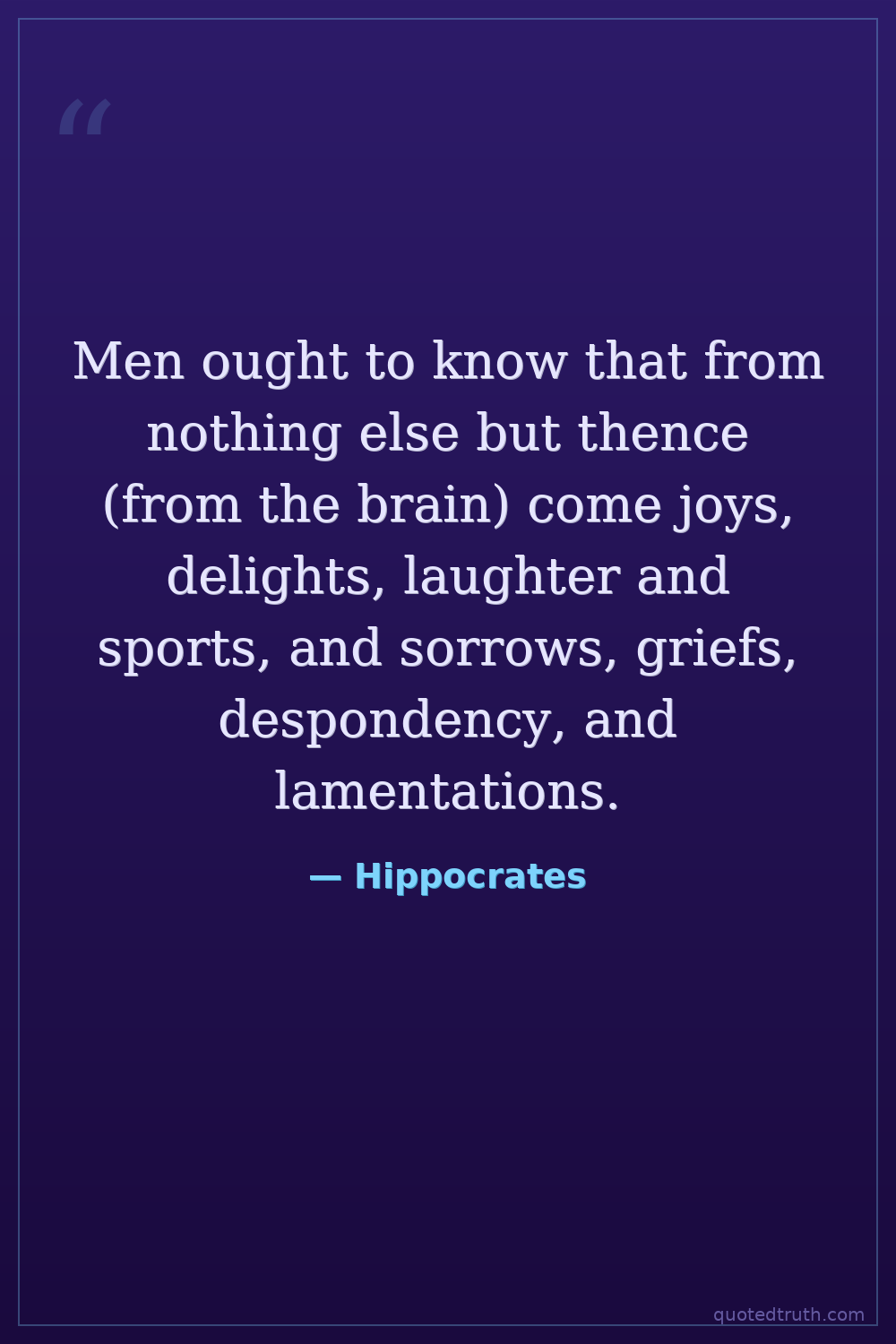 Men ought to know that from nothing else but thence (from the brain) come joys, delights, laughter and sports, and sorrows, griefs, despondency, and lamentations.