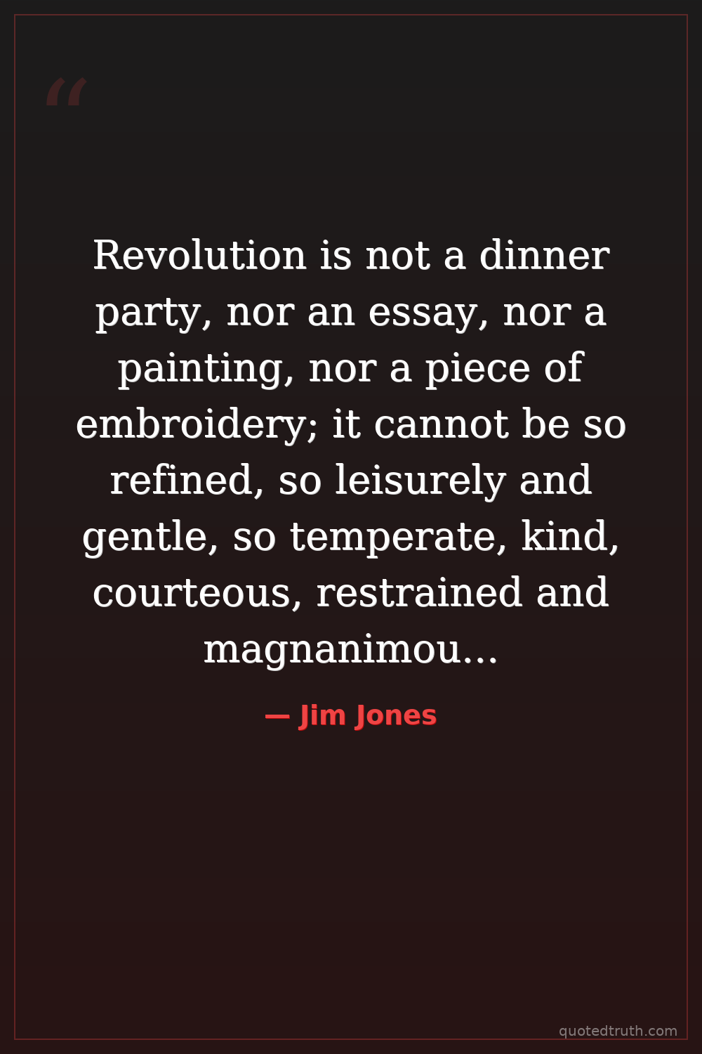 Revolution is not a dinner party, nor an essay, nor a painting, nor a piece of embroidery; it cannot be so refined, so leisurely and gentle, so temperate, kind, courteous, restrained and magnanimous. A revolution is an insurrection, an act of violence by which one class overthrows another.