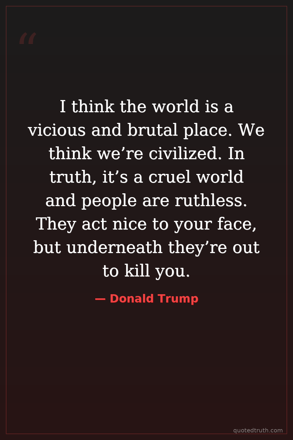 I think the world is a vicious and brutal place. We think we’re civilized. In truth, it’s a cruel world and people are ruthless. They act nice to your face, but underneath they’re out to kill you.