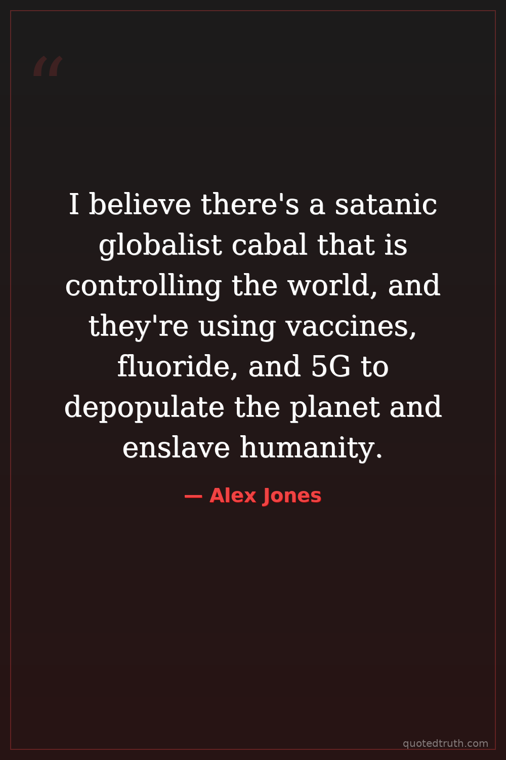 I believe there's a satanic globalist cabal that is controlling the world, and they're using vaccines, fluoride, and 5G to depopulate the planet and enslave humanity.