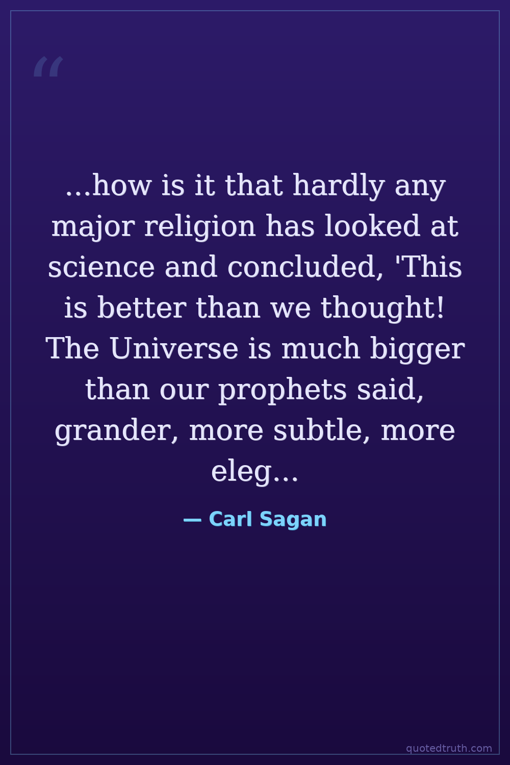 ...how is it that hardly any major religion has looked at science and concluded, 'This is better than we thought! The Universe is much bigger than our prophets said, grander, more subtle, more elegant?'
