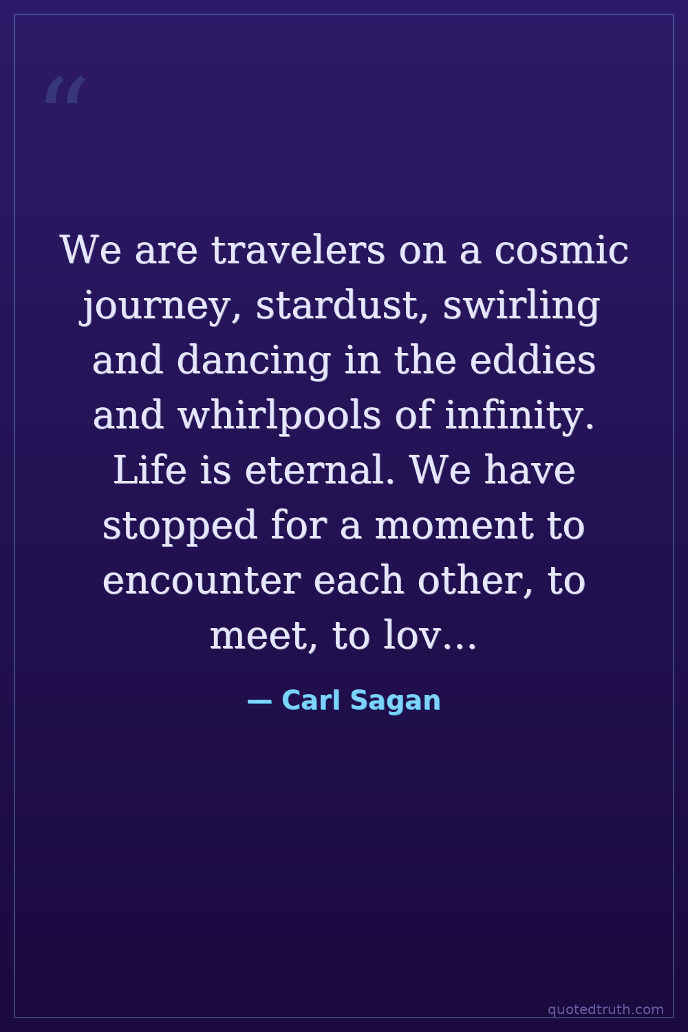 We are travelers on a cosmic journey, stardust, swirling and dancing in the eddies and whirlpools of infinity. Life is eternal. We have stopped for a moment to encounter each other, to meet, to love, to share. This is a precious moment.
