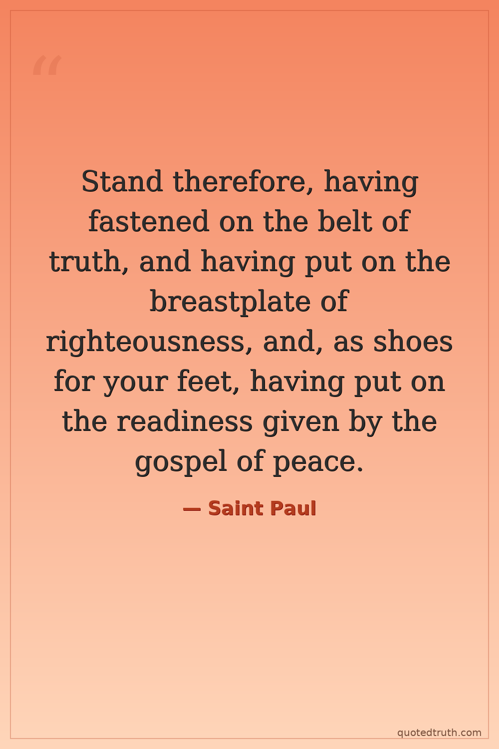 Stand therefore, having fastened on the belt of truth, and having put on the breastplate of righteousness, and, as shoes for your feet, having put on the readiness given by the gospel of peace.