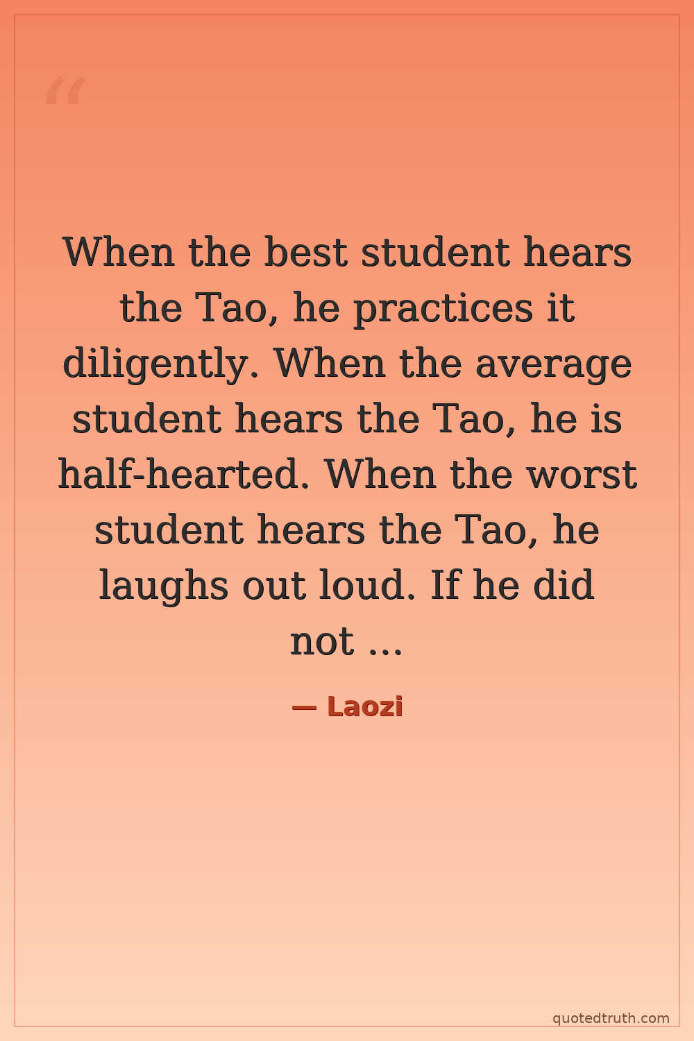 When the best student hears the Tao, he practices it diligently. When the average student hears the Tao, he is half-hearted. When the worst student hears the Tao, he laughs out loud. If he did not laugh, it would not be the Tao.