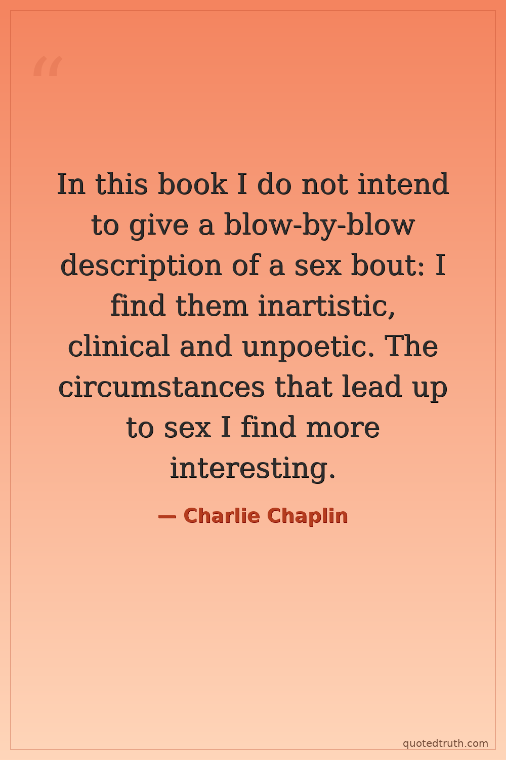 In this book I do not intend to give a blow-by-blow description of a sex bout: I find them inartistic, clinical and unpoetic. The circumstances that lead up to sex I find more interesting.