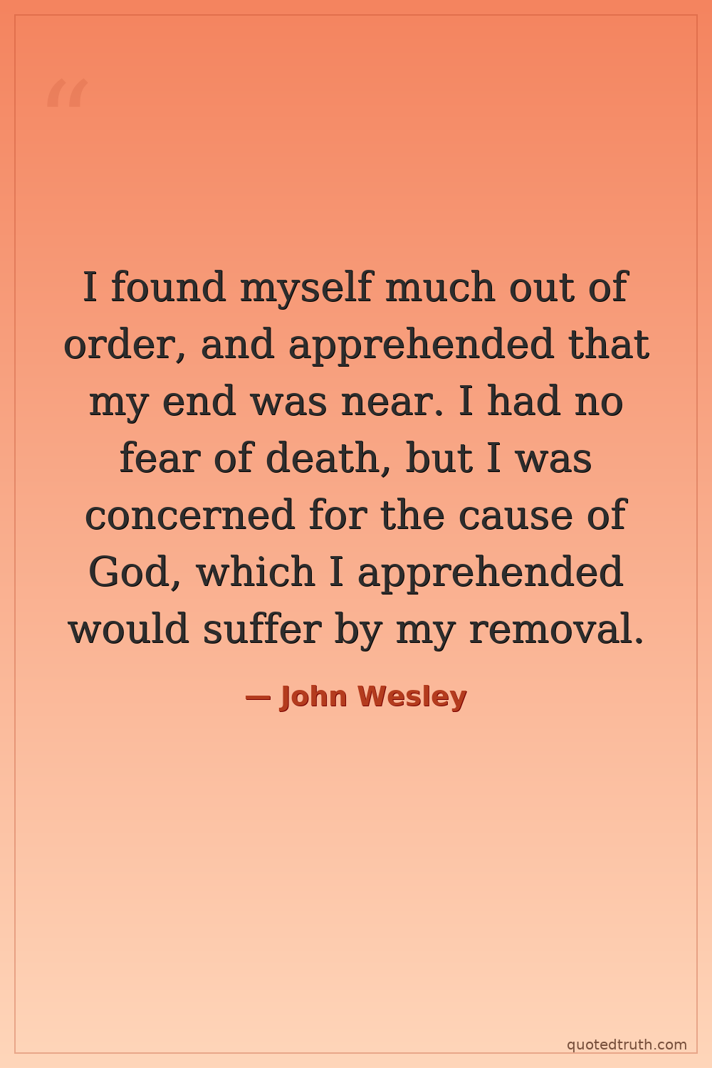 I found myself much out of order, and apprehended that my end was near. I had no fear of death, but I was concerned for the cause of God, which I apprehended would suffer by my removal.