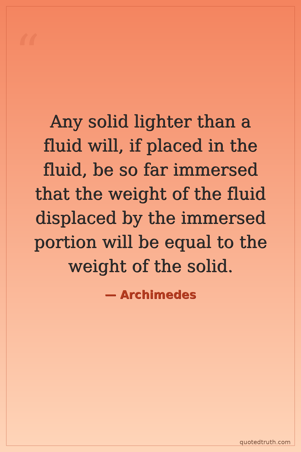 Any solid lighter than a fluid will, if placed in the fluid, be so far immersed that the weight of the fluid displaced by the immersed portion will be equal to the weight of the solid.