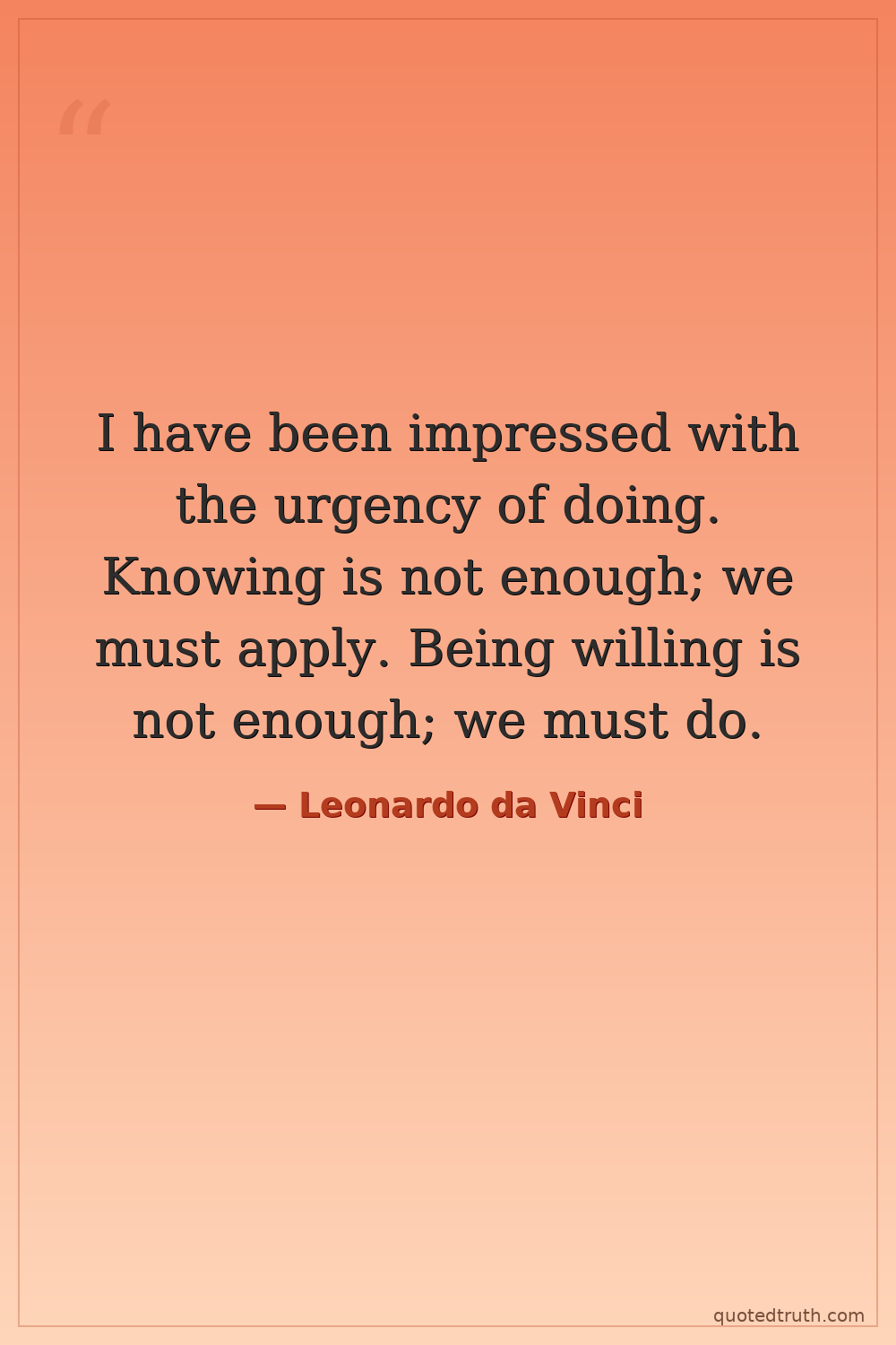 I have been impressed with the urgency of doing. Knowing is not enough; we must apply. Being willing is not enough; we must do.
