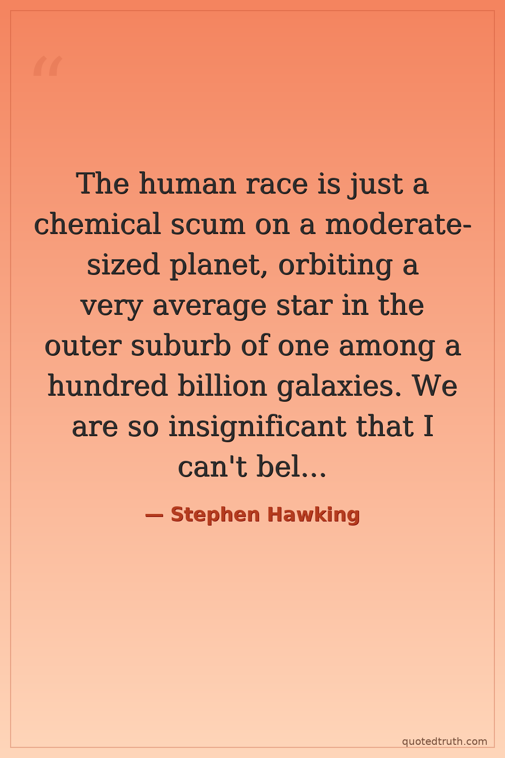 The human race is just a chemical scum on a moderate-sized planet, orbiting a very average star in the outer suburb of one among a hundred billion galaxies. We are so insignificant that I can't believe the whole universe exists for our benefit. That would be a pretty hefty waste of space.
