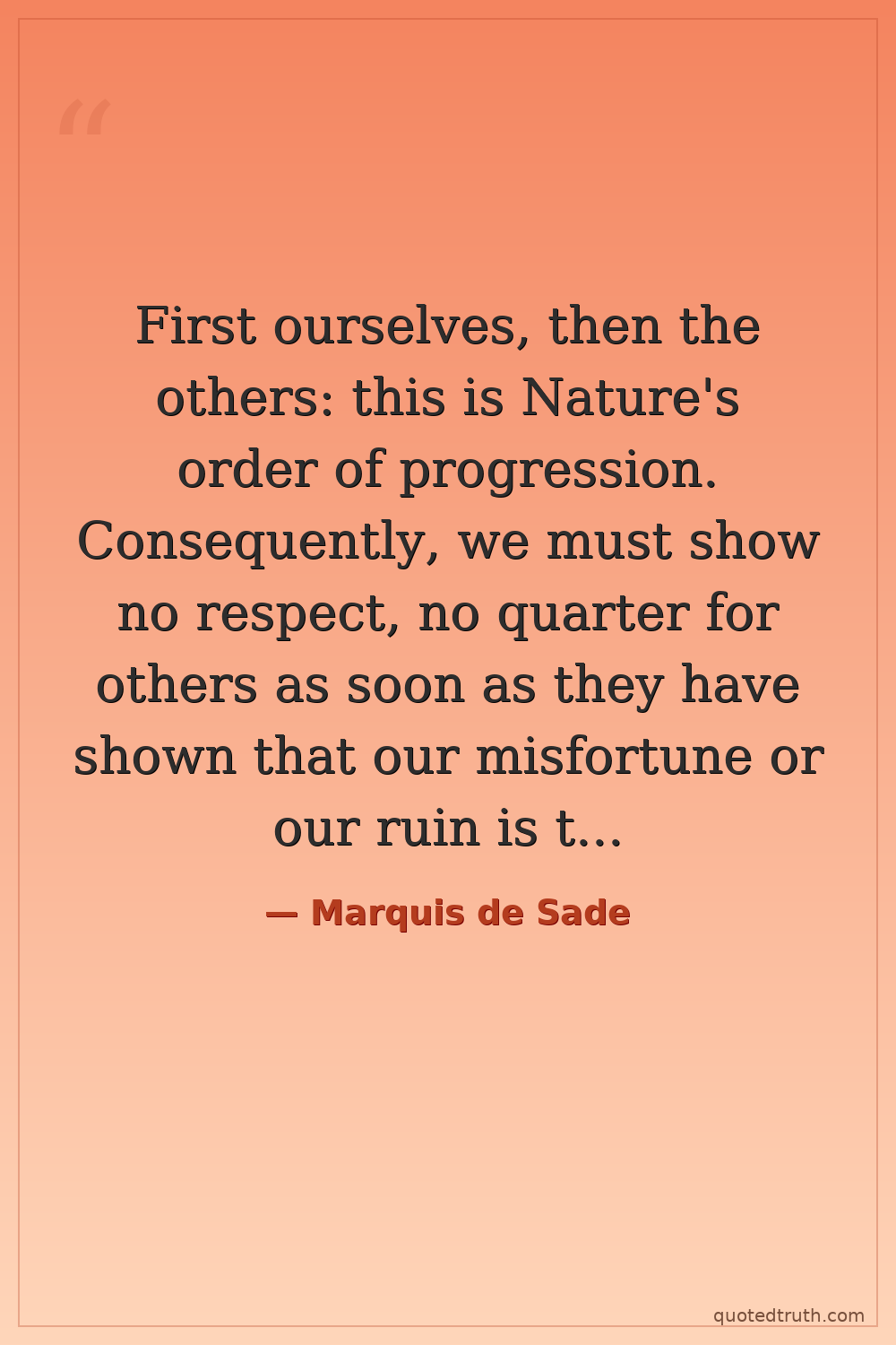 First ourselves, then the others: this is Nature's order of progression. Consequently, we must show no respect, no quarter for others as soon as they have shown that our misfortune or our ruin is the object of their desires. To act differently, my daughter, would be show preference for others above ourselves, and that would be absurd.