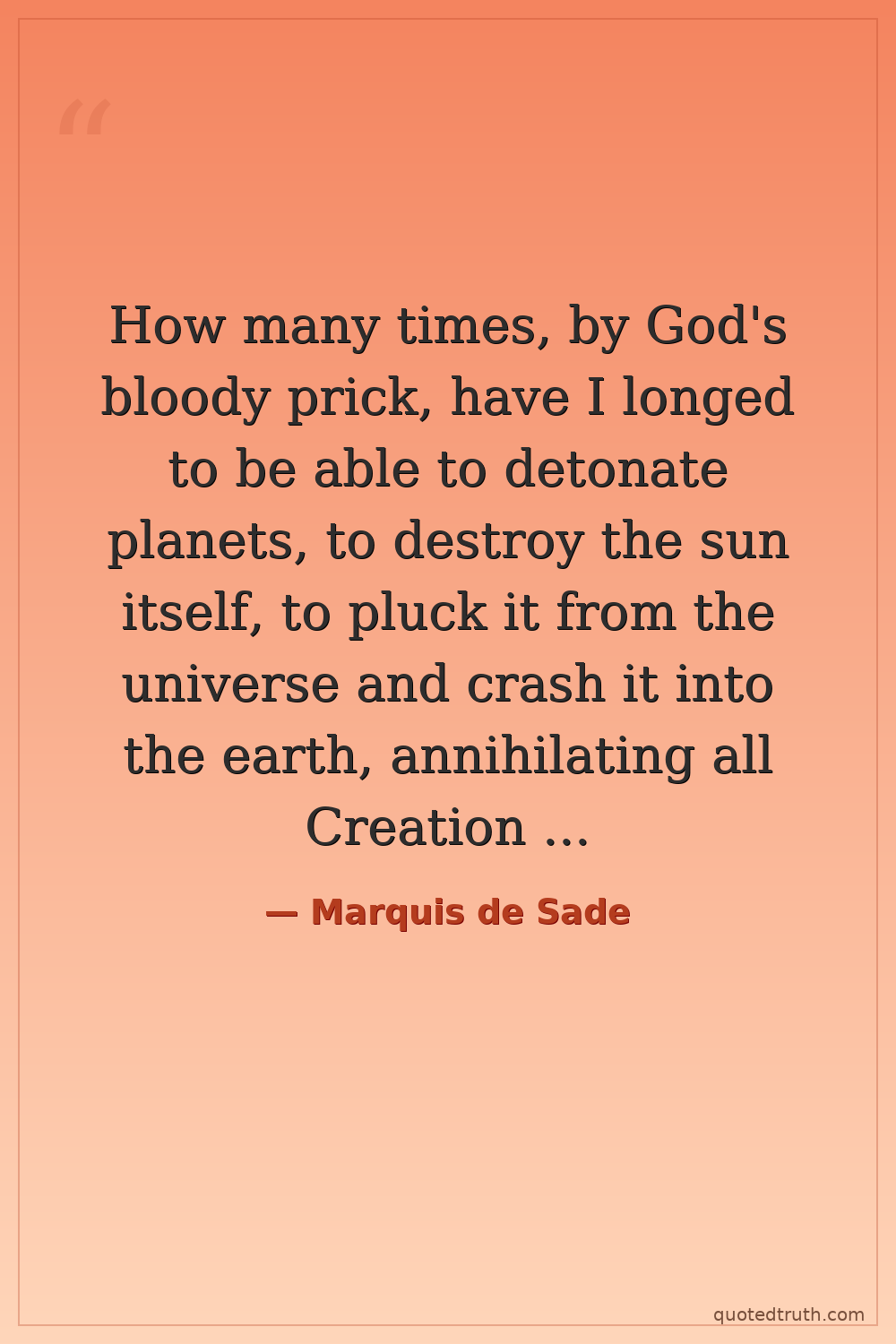 How many times, by God's bloody prick, have I longed to be able to detonate planets, to destroy the sun itself, to pluck it from the universe and crash it into the earth, annihilating all Creation and replacing it with a lightless void of violence. Ah, that would be a crime! A cosmic crime, dwarfing the petty misdemeanours we are committing here, limited as we are to snuffing out a few meaningless souls.