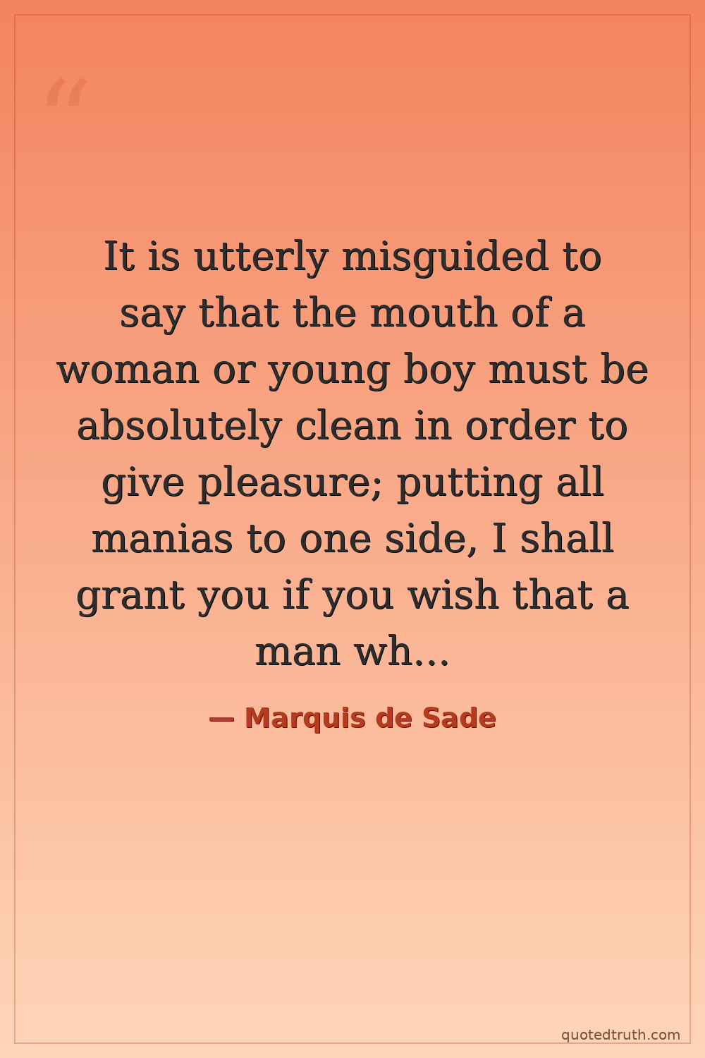 It is utterly misguided to say that the mouth of a woman or young boy must be absolutely clean in order to give pleasure; putting all manias to one side, I shall grant you if you wish that a man who craves a stinking mouth does so only out of depravity, but you must in return grant me that a mouth without the slightest fragrance gives no pleasure at all when kissed – there must always be a certain spice, a certain piquancy to all such pleasures and this picquancy is found only in a little filth.