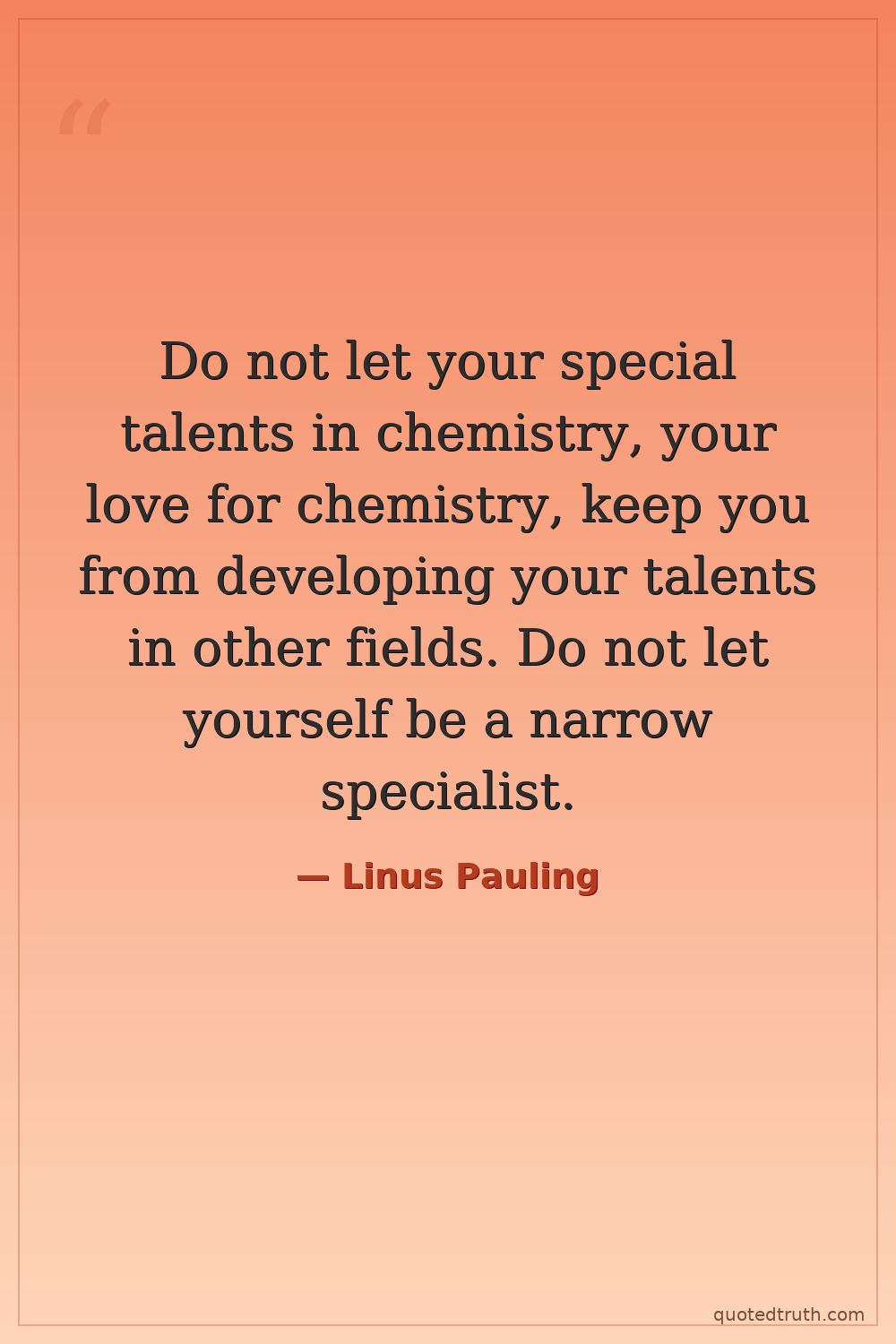 Do not let your special talents in chemistry, your love for chemistry, keep you from developing your talents in other fields. Do not let yourself be a narrow specialist.