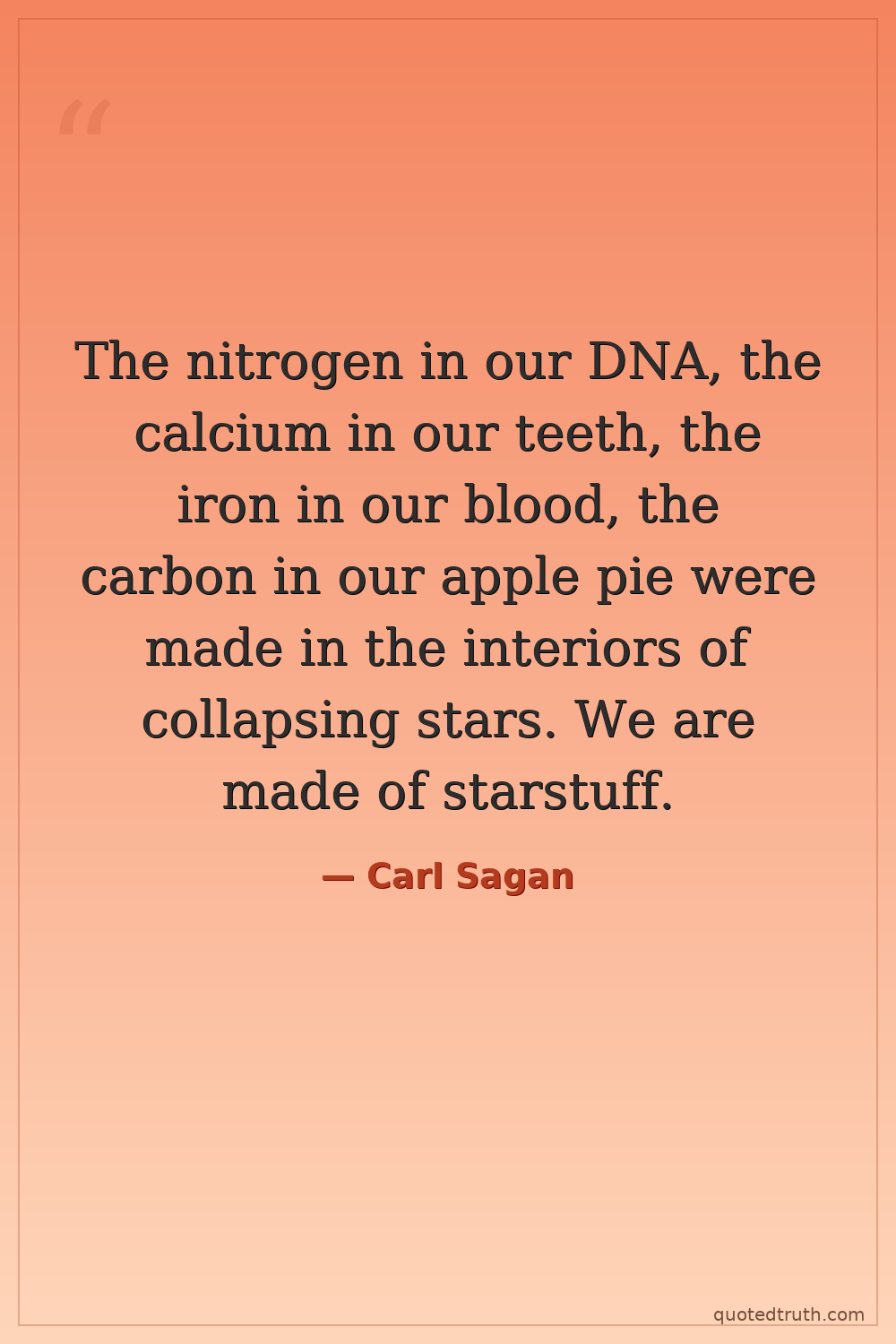The nitrogen in our DNA, the calcium in our teeth, the iron in our blood, the carbon in our apple pie were made in the interiors of collapsing stars. We are made of starstuff.