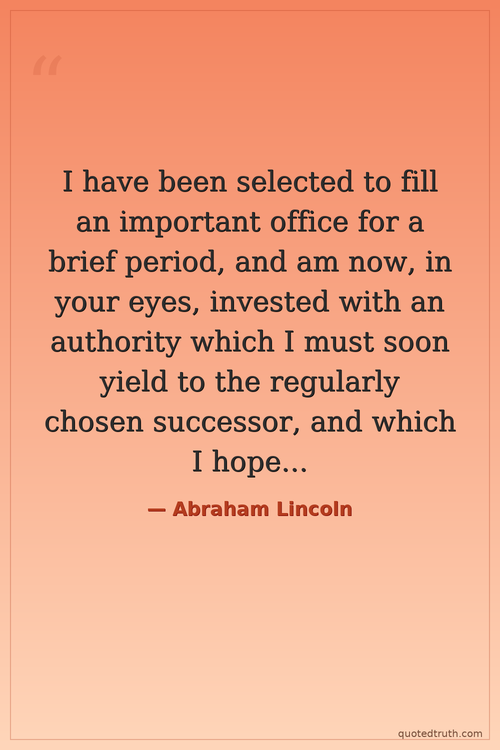 I have been selected to fill an important office for a brief period, and am now, in your eyes, invested with an authority which I must soon yield to the regularly chosen successor, and which I hope to use for your benefit.