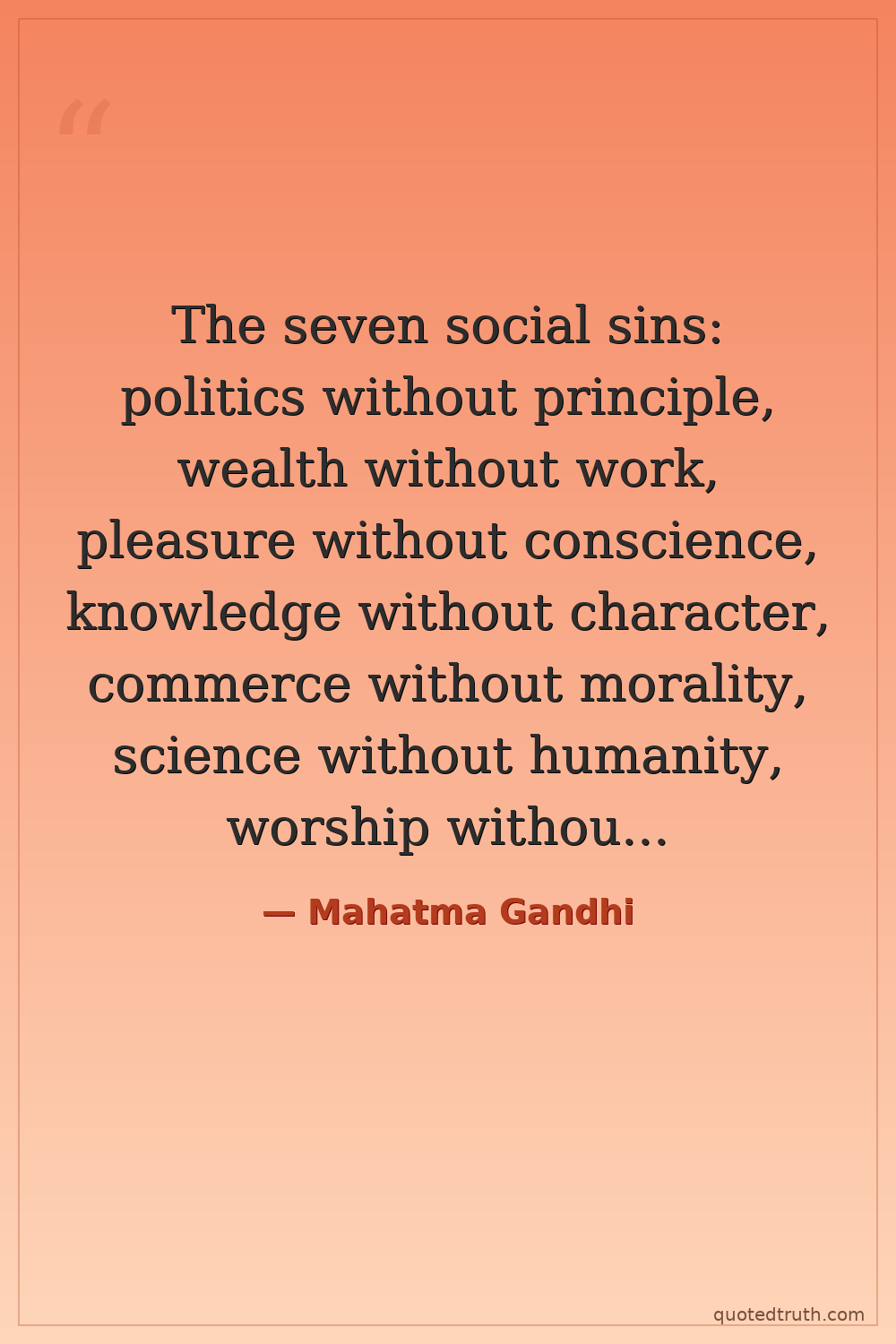 The seven social sins: politics without principle, wealth without work, pleasure without conscience, knowledge without character, commerce without morality, science without humanity, worship without sacrifice.