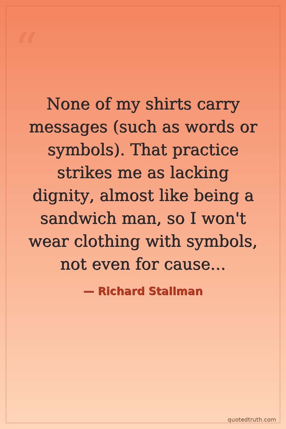 None of my shirts carry messages (such as words or symbols). That practice strikes me as lacking dignity, almost like being a sandwich man, so I won't wear clothing with symbols, not even for causes I support.