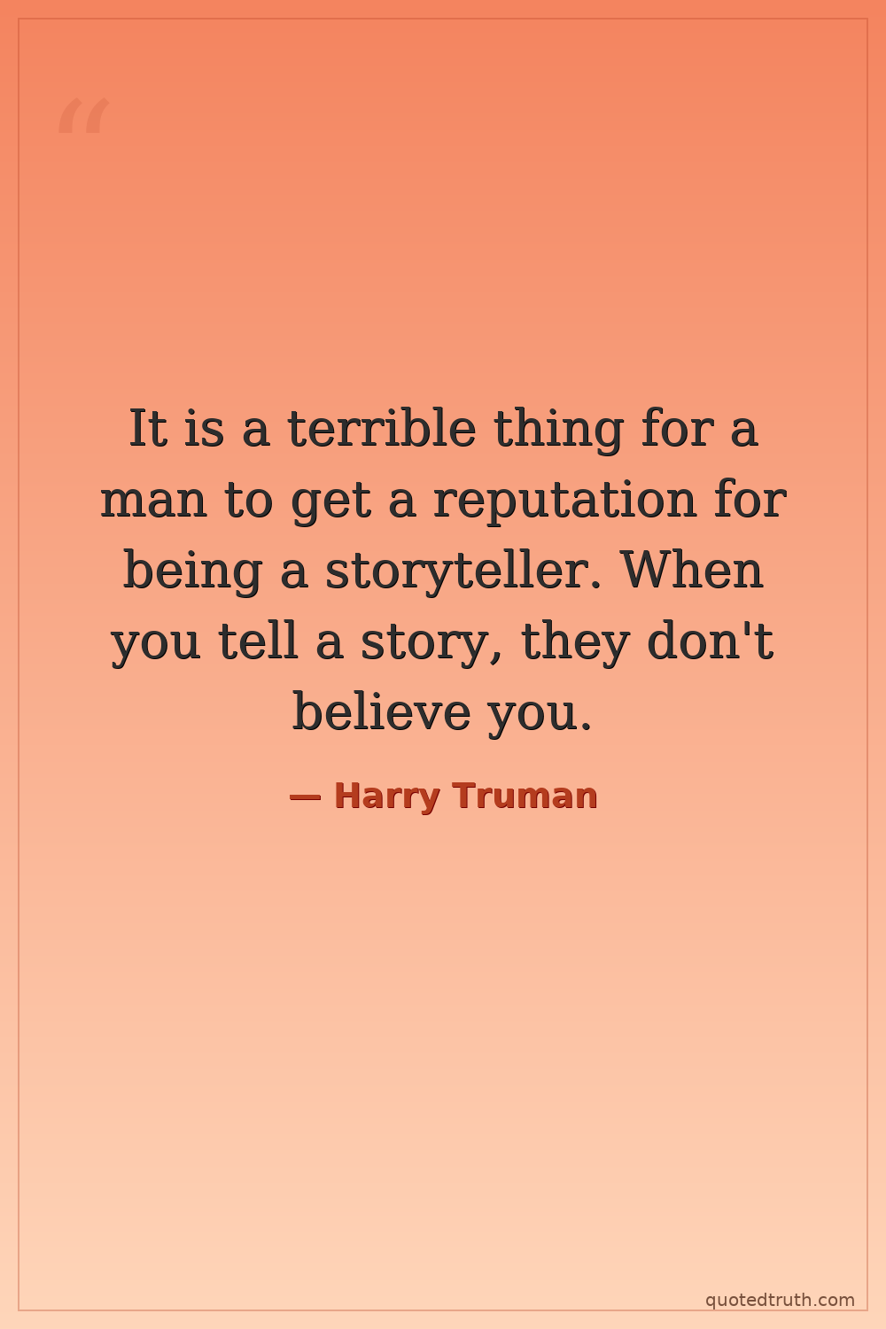 It is a terrible thing for a man to get a reputation for being a storyteller. When you tell a story, they don't believe you.