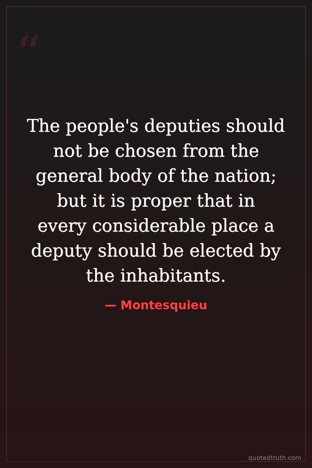 The people's deputies should not be chosen from the general body of the nation; but it is proper that in every considerable place a deputy should be elected by the inhabitants.