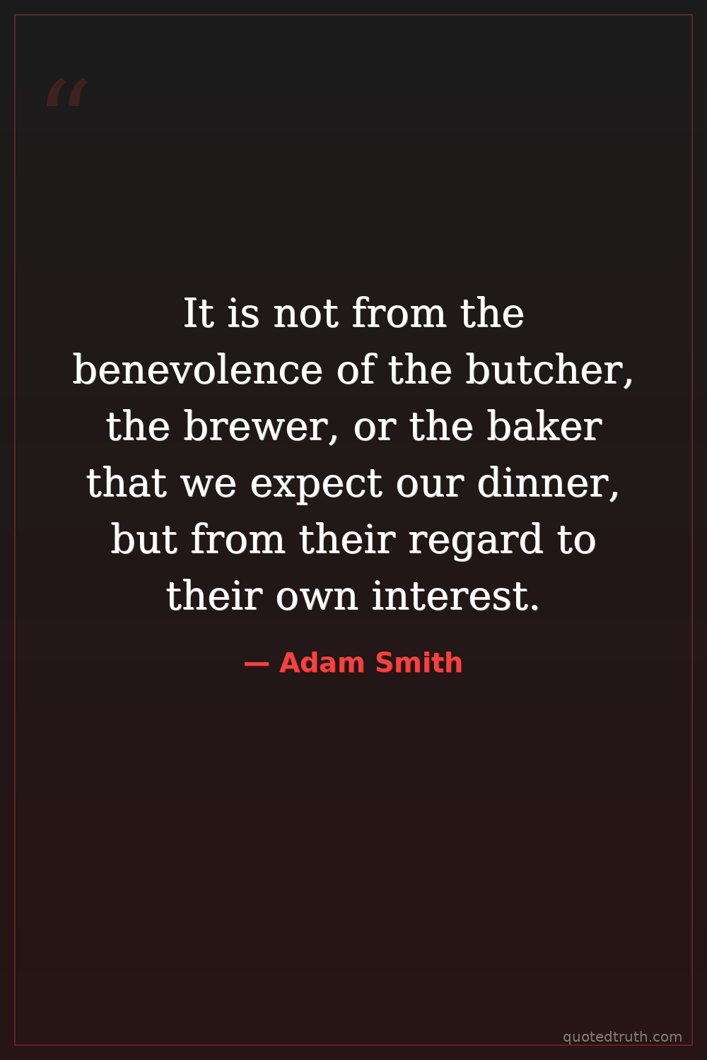 It is not from the benevolence of the butcher, the brewer, or the baker that we expect our dinner, but from their regard to their own interest.