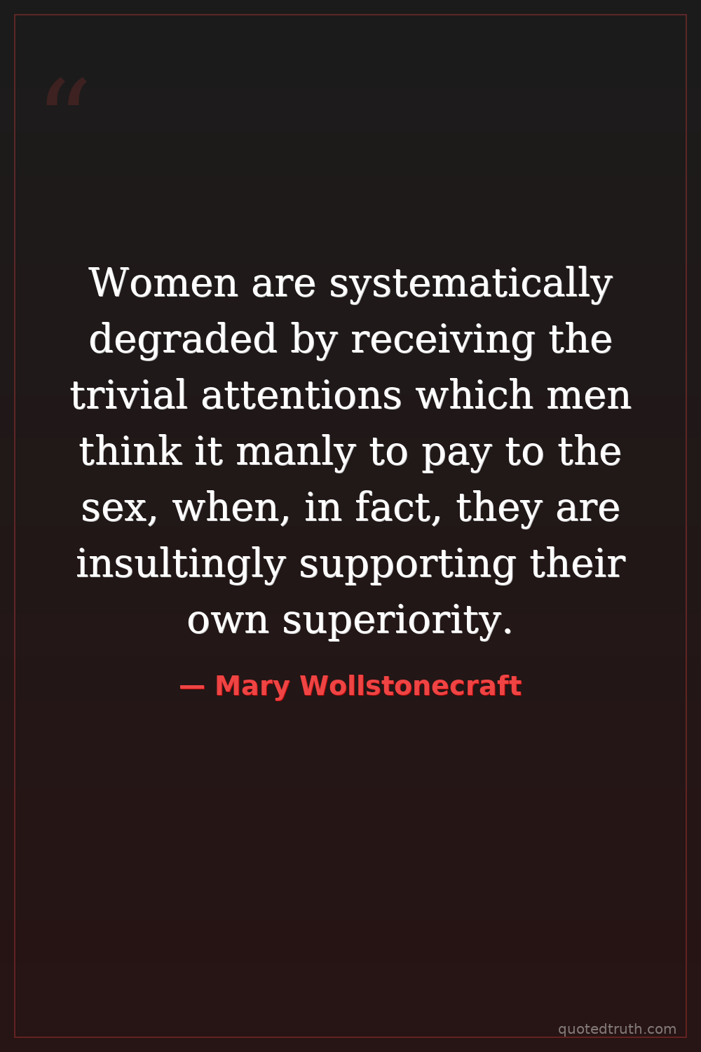 Women are systematically degraded by receiving the trivial attentions which men think it manly to pay to the sex, when, in fact, they are insultingly supporting their own superiority.