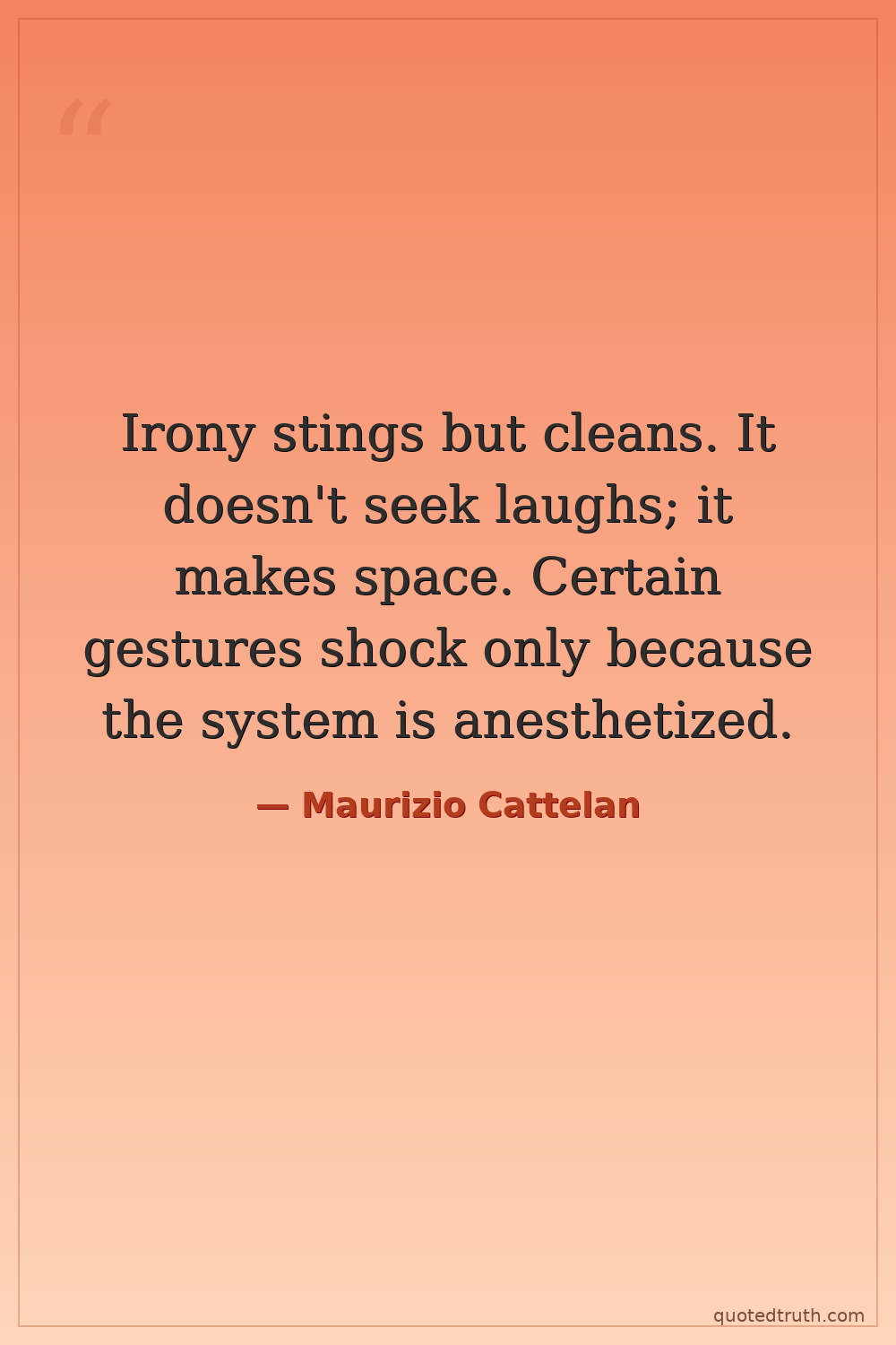 Irony stings but cleans. It doesn't seek laughs; it makes space. Certain gestures shock only because the system is anesthetized.