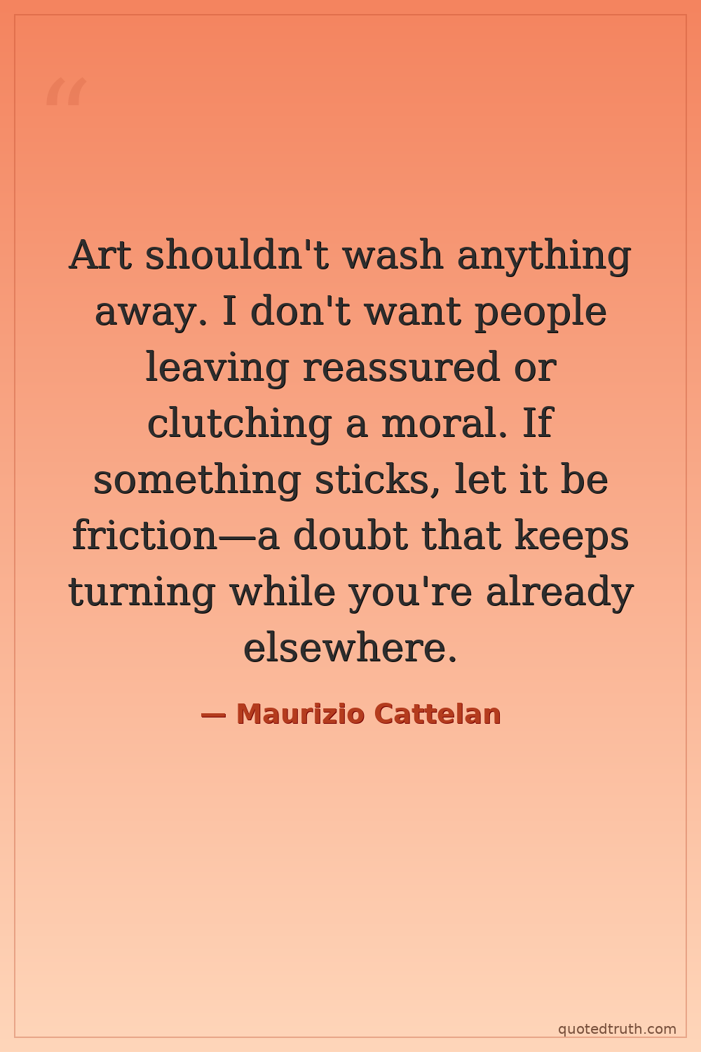 Art shouldn't wash anything away. I don't want people leaving reassured or clutching a moral. If something sticks, let it be friction—a doubt that keeps turning while you're already elsewhere.