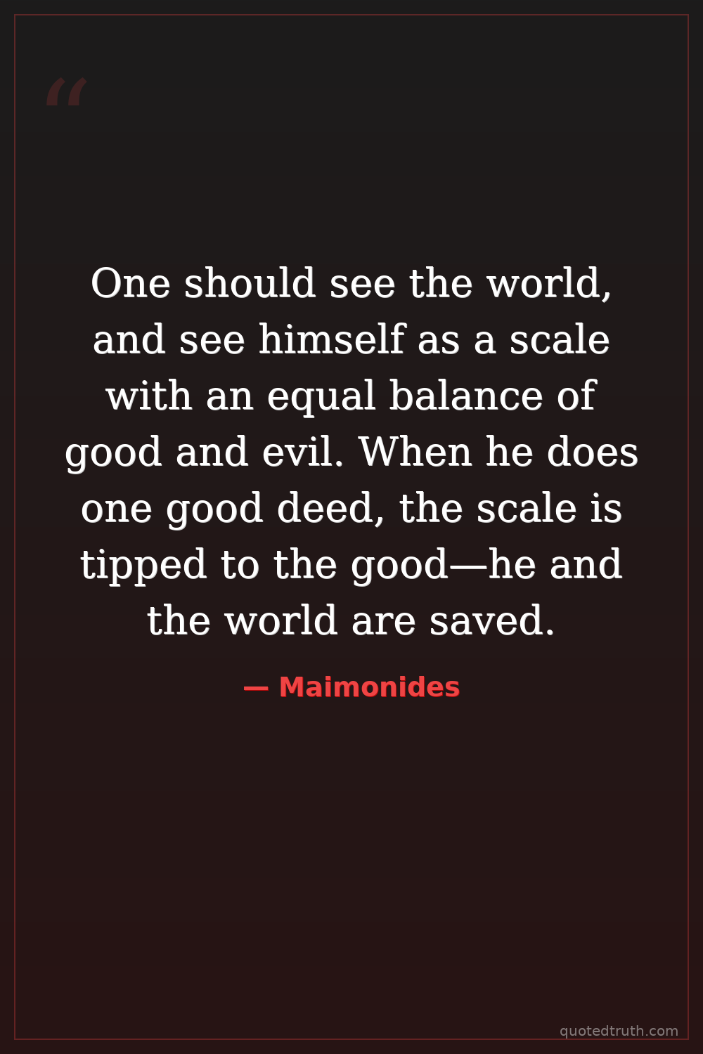 One should see the world, and see himself as a scale with an equal balance of good and evil. When he does one good deed, the scale is tipped to the good—he and the world are saved.