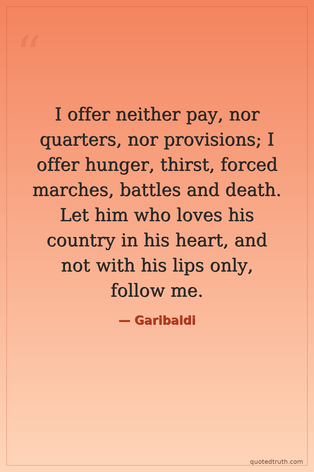 I offer neither pay, nor quarters, nor provisions; I offer hunger, thirst, forced marches, battles and death. Let him who loves his country in his heart, and not with his lips only, follow me.