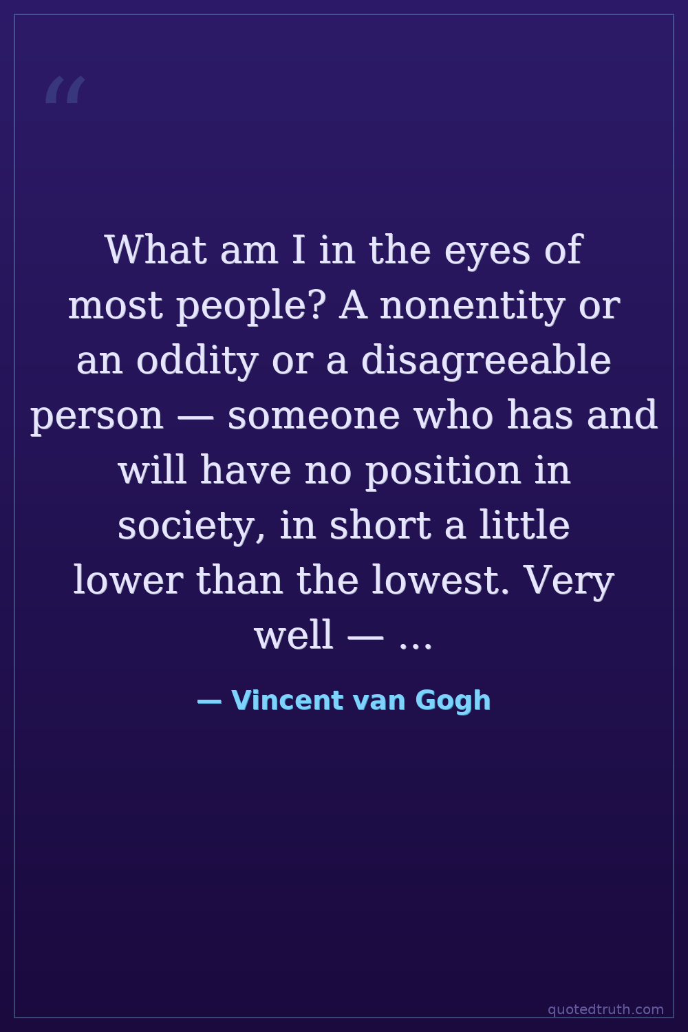 What am I in the eyes of most people? A nonentity or an oddity or a disagreeable person — someone who has and will have no position in society, in short a little lower than the lowest. Very well — assuming that everything is indeed like that, then through my work I'd like to show what there is in the heart of such an oddity, such a nobody.