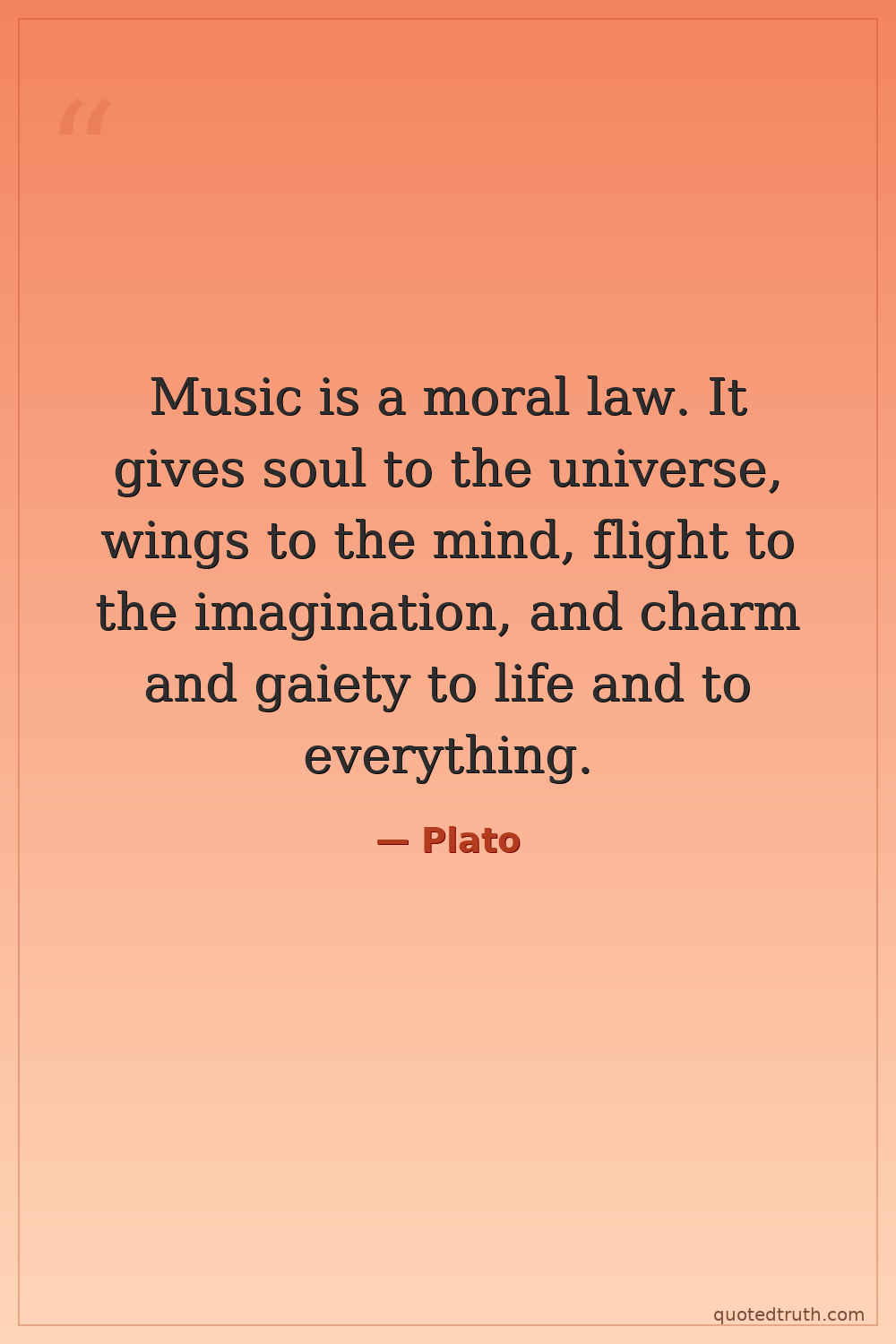 Music is a moral law. It gives soul to the universe, wings to the mind, flight to the imagination, and charm and gaiety to life and to everything.