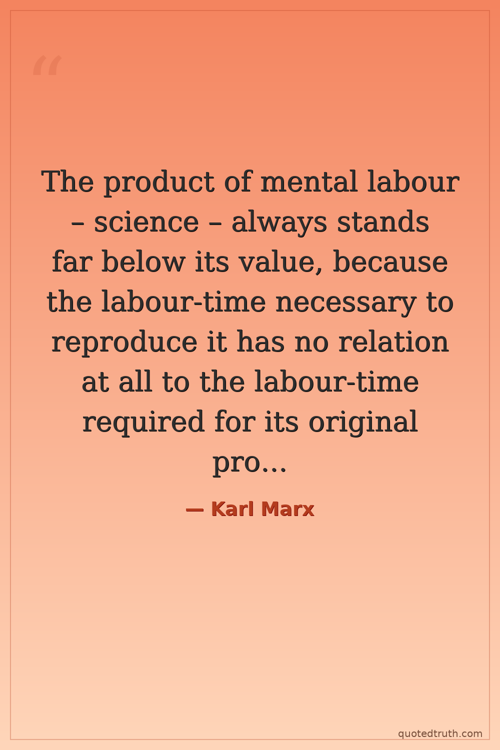 The product of mental labour – science – always stands far below its value, because the labour-time necessary to reproduce it has no relation at all to the labour-time required for its original production.