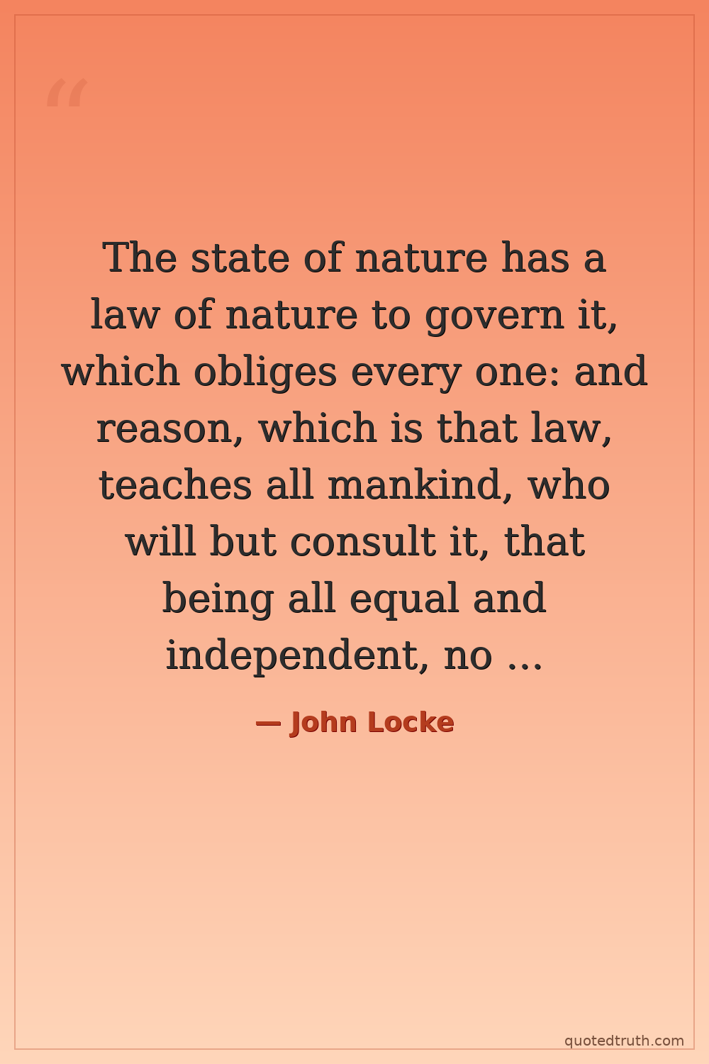 The state of nature has a law of nature to govern it, which obliges every one: and reason, which is that law, teaches all mankind, who will but consult it, that being all equal and independent, no one ought to harm another in his life, health, liberty, or possessions.