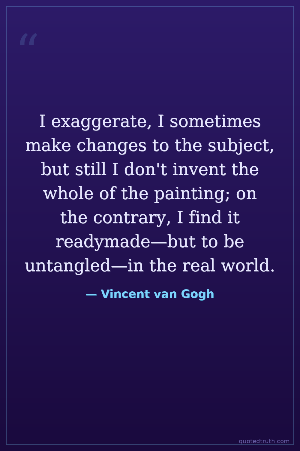 I exaggerate, I sometimes make changes to the subject, but still I don't invent the whole of the painting; on the contrary, I find it readymade—but to be untangled—in the real world.