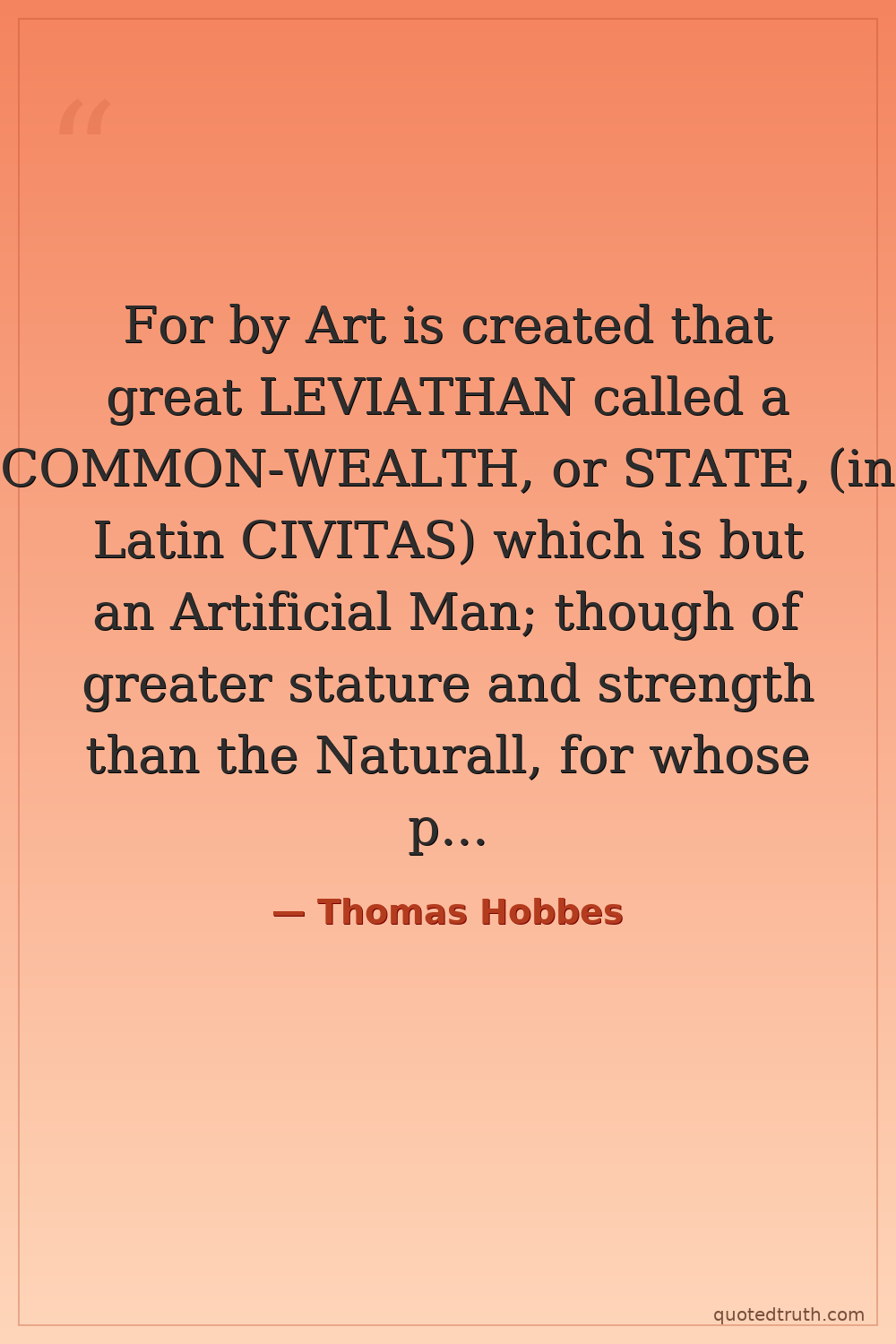 For by Art is created that great LEVIATHAN called a COMMON-WEALTH, or STATE, (in Latin CIVITAS) which is but an Artificial Man; though of greater stature and strength than the Naturall, for whose protection and defence it was intended.