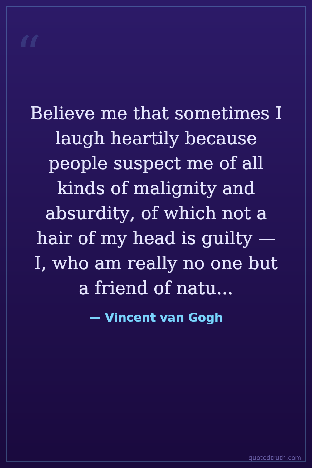 Believe me that sometimes I laugh heartily because people suspect me of all kinds of malignity and absurdity, of which not a hair of my head is guilty — I, who am really no one but a friend of nature, of study, of work, and especially of people.