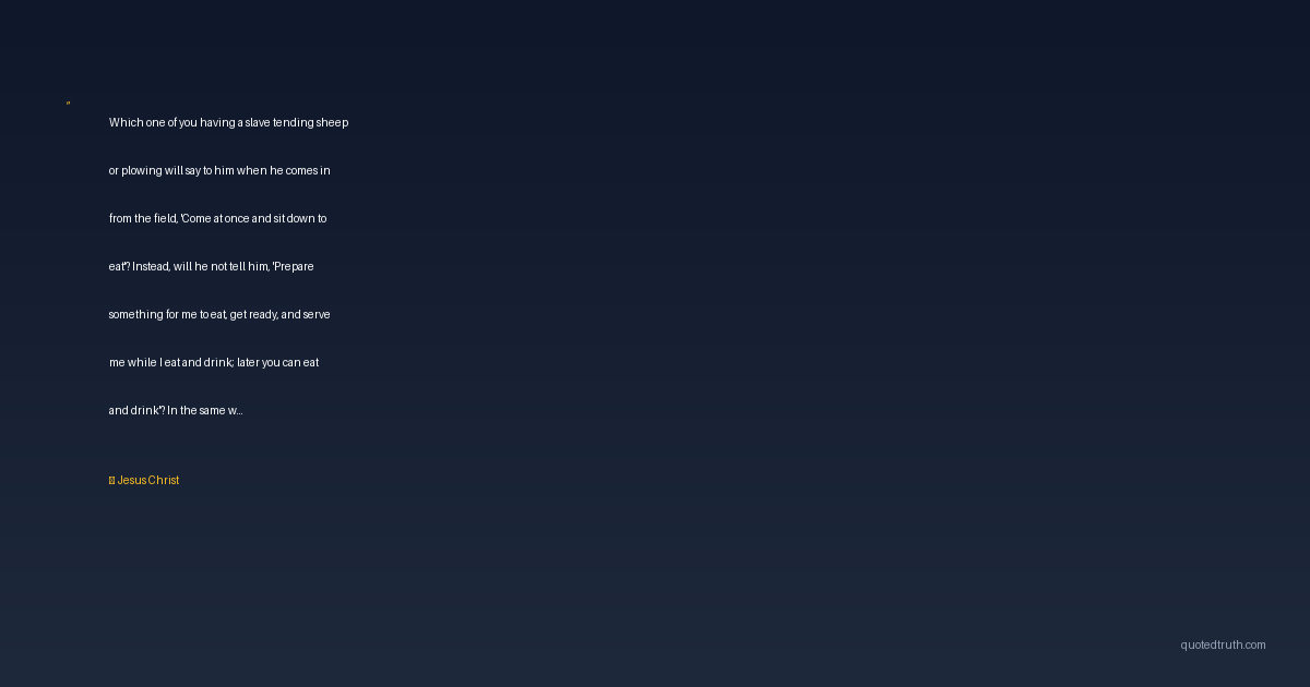 Which one of you having a slave tending sheep or plowing will say to him when he comes in from the field, 'Come at once and sit down to eat'? Instead, will he not tell him, 'Prepare something for me to eat, get ready, and serve me while I eat and drink; later you can eat and drink'? In the same way, when you have done all that you were commanded, you should say, 'We are good-for-nothing slaves; we've only done our duty.'