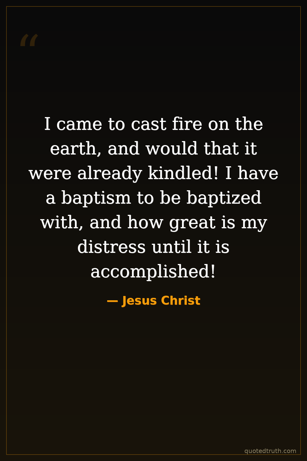 I came to cast fire on the earth, and would that it were already kindled! I have a baptism to be baptized with, and how great is my distress until it is accomplished!