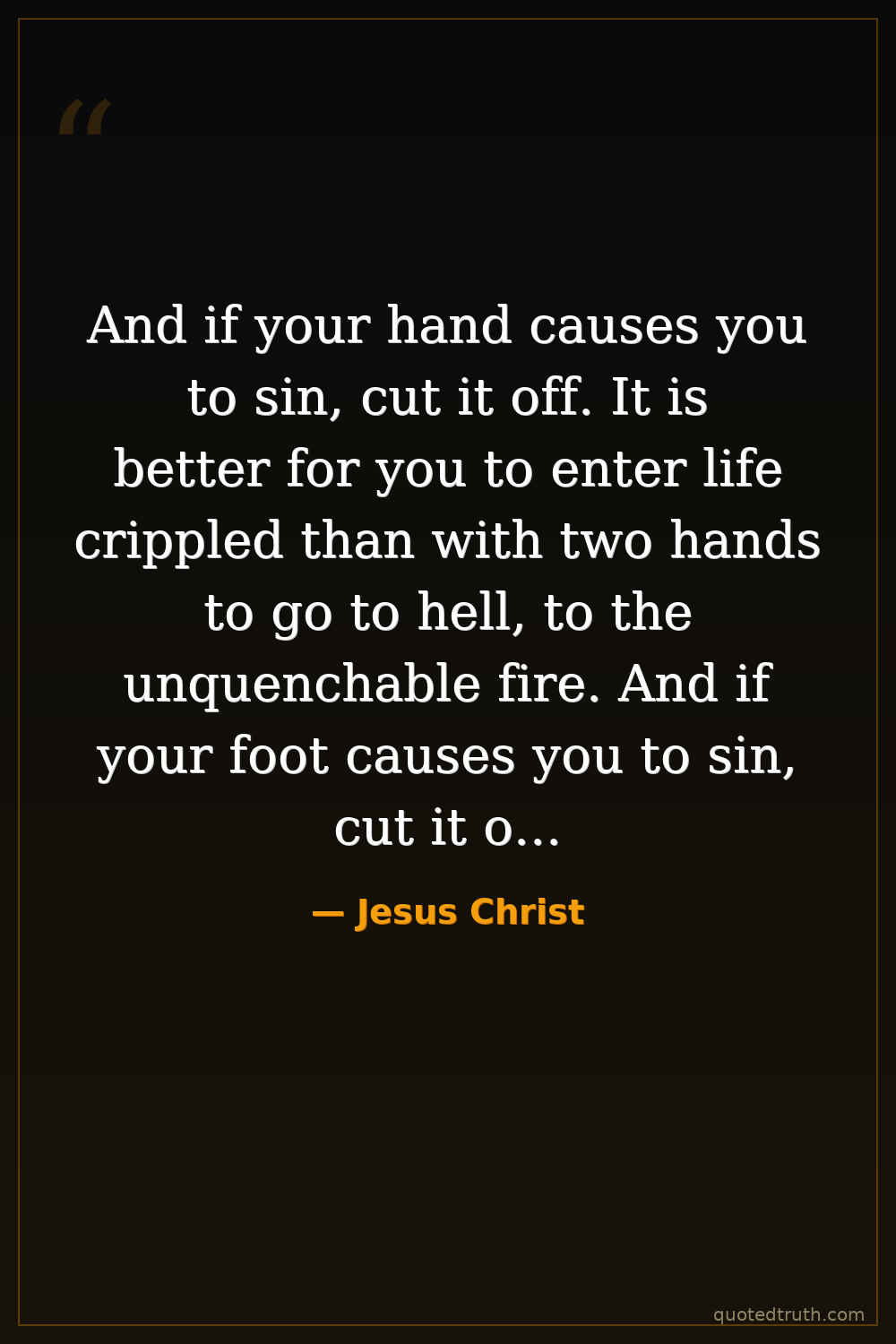 And if your hand causes you to sin, cut it off. It is better for you to enter life crippled than with two hands to go to hell, to the unquenchable fire. And if your foot causes you to sin, cut it off. It is better for you to enter life lame than with two feet to be thrown into hell.