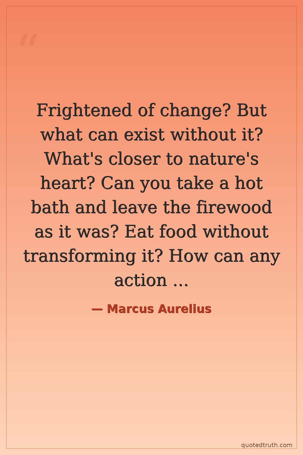 Frightened of change? But what can exist without it? What's closer to nature's heart? Can you take a hot bath and leave the firewood as it was? Eat food without transforming it? How can any action be accomplished without change? Don't you see? Your own transformation is just as necessary to nature as theirs.