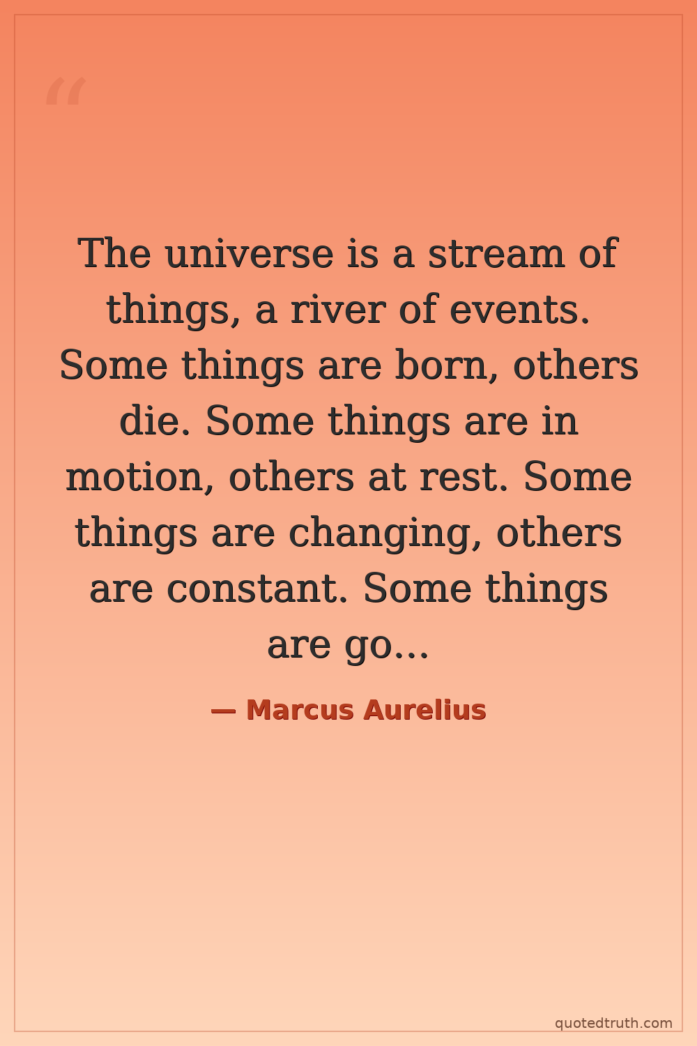 The universe is a stream of things, a river of events. Some things are born, others die. Some things are in motion, others at rest. Some things are changing, others are constant. Some things are good, others evil. Some things are beautiful, others ugly. Some things are true, others false. Some things are just, others unjust. Some things are useful, others useless. Some things are necessary, others unnecessary. Some things are pleasant, others unpleasant. Some things are easy, others difficult. Some things are possible, others impossible. All these things exist and flow in the universe. Do not cling to them, do not resist them, do not judge them. Just observe them and let them pass.