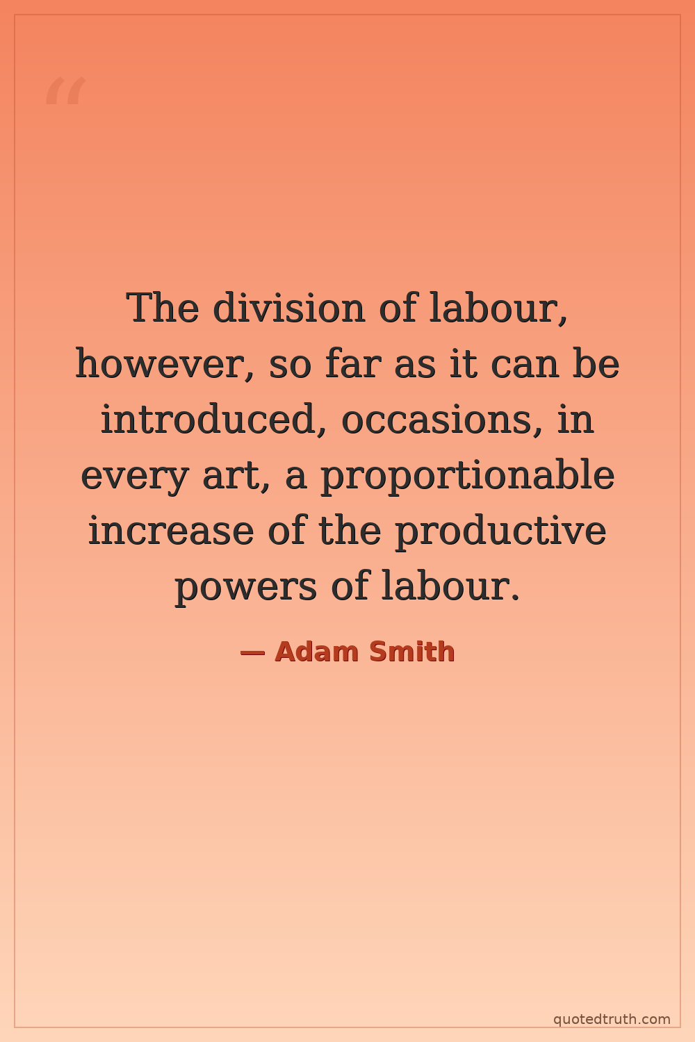 The division of labour, however, so far as it can be introduced, occasions, in every art, a proportionable increase of the productive powers of labour.