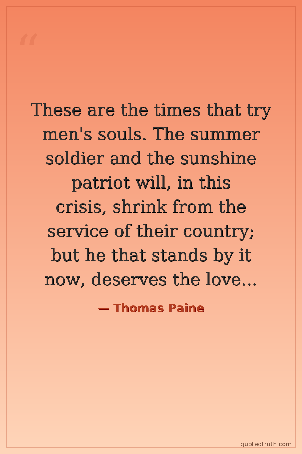 These are the times that try men's souls. The summer soldier and the sunshine patriot will, in this crisis, shrink from the service of their country; but he that stands by it now, deserves the love and thanks of man and woman.